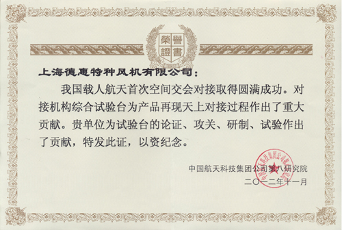 中国航天科技集团公司第八研究院荣誉证书德惠